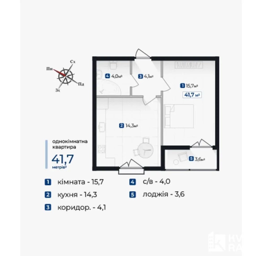 • Общая площадь 41.7 м2