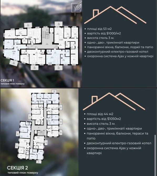 - ексклюзивні планування кожної квартири, на верхніх поверхах планування квартир з антресолями (другим світлом);