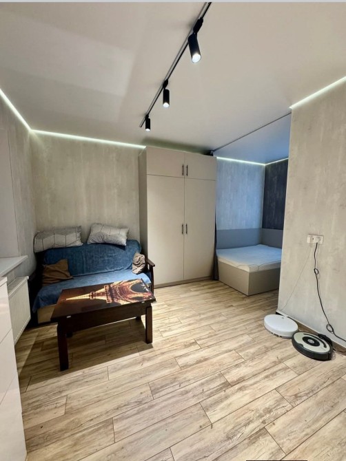 Меблі: Вбудована кухня, місткі шафи-купе, зручне ліжко у ніші та диван у зоні відпочинку.