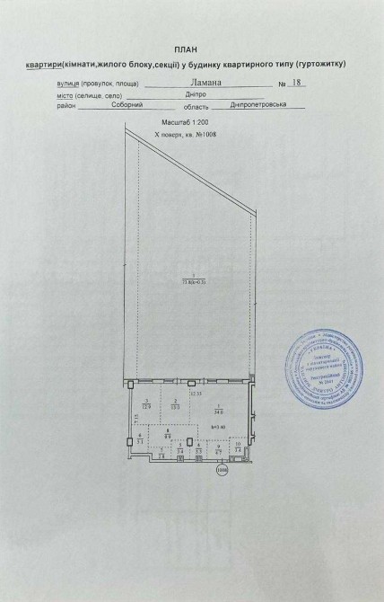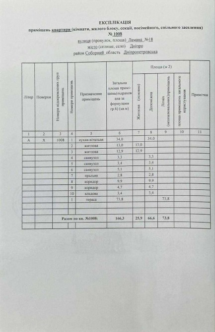 загальна площа: 166,3 м. кв. (З них квартира 92м.кв, тераса 73,8м (з урахуванням застосованого коефіцієнта 0,3 в реальності 221,4м)