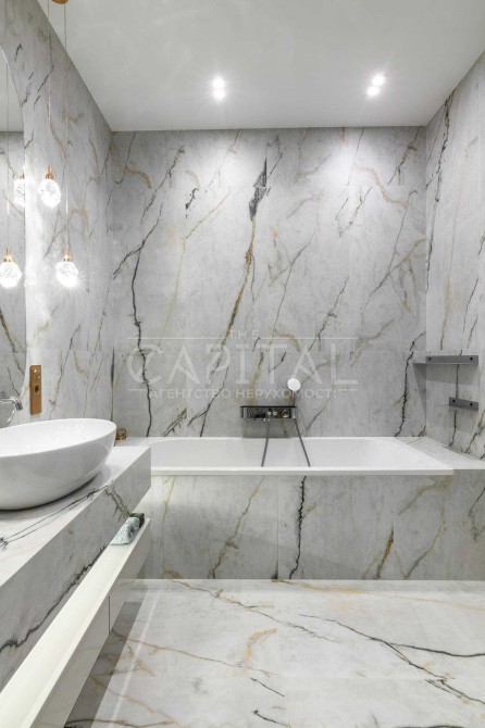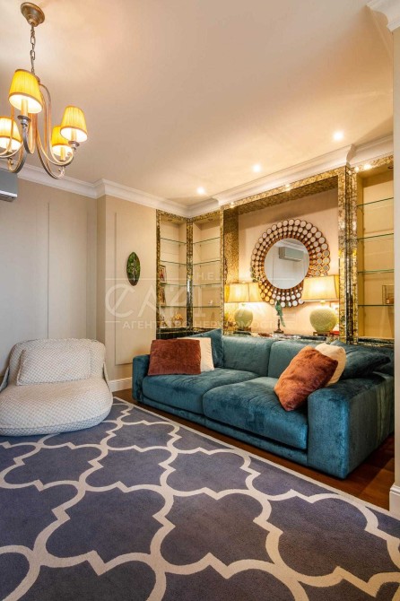Інтер’єр квартири виконаний у високоякісному стилі з використанням екологічних матеріалів, що підкреслюють її розкіш і сучасність. Італійські меблі від відомих виробників доповнюють раціональне планування, яке включає продумані системи зберігання. Встановлена система очищення води покращує її якість та допомагає зберегти не лише сантехніку, але й стан шкіри. Тепла підлога і сигналізація додають комфорту і безпеки. Висота стелі 3 метри, стіни виконані з цегли, що забезпечує додатковий затишок.