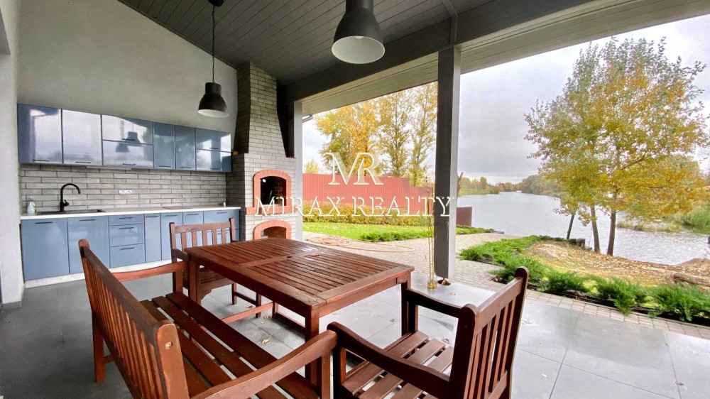 Продаж нового сучасного будинку 150 м2, 1-ша лінія, вихід в р. Дніпро, Осокорки, 1й шлюз, Київ. Будинок збудований в один поверх з газоблоку (40 см), утеплений мінеральною ватою (15см), дах – метало черепиця. В будинку зроблено якісний ремонт, підвісна стеля, підлога з підігрівом – вініл. Будинок має функціональне планування, кухня-вітальня з каміном та окремим виходом на терасу, спальня, сауна з кімнатою відпочинку з окремим виходом на терасу та до річки, санвузол, передпокій, котельня, відкрита тераса з зоною барбекю та вбудованою кухнею. Будинок повністю мебльований та укомплектований всією необхідною технікою, підігрів підлоги, висота стелі Н 3,8 м. На ділянці 20 соток виконано ландшафтний дизайн, автоматичні ворота, облаштований пирс. Комунікації: електрика -15 кВт, свердловина, септик. Закрита територія, обладнаний спортивний майданчик, асфальтований під'їзд, шлагбаум, охорона. Місце для поціновувачів тихого, спокійного життя біля води поруч з містом. Будинок мрія!
