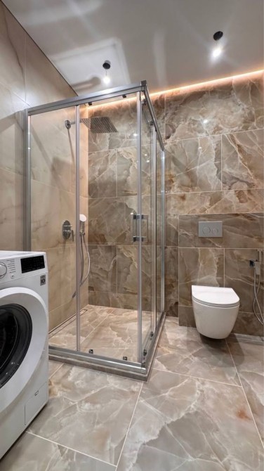 Ванна кімната з душовою кабіною, пральною машиною.