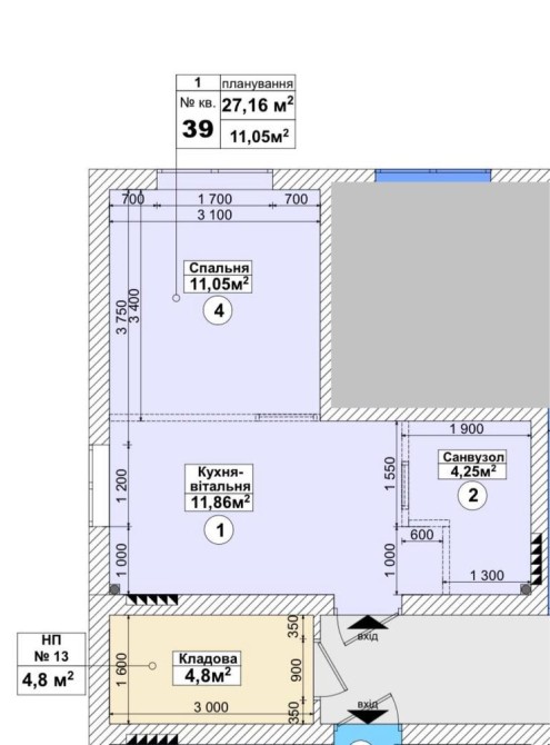 • Общая площадь 27 м2