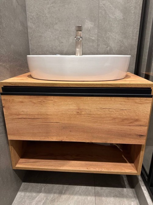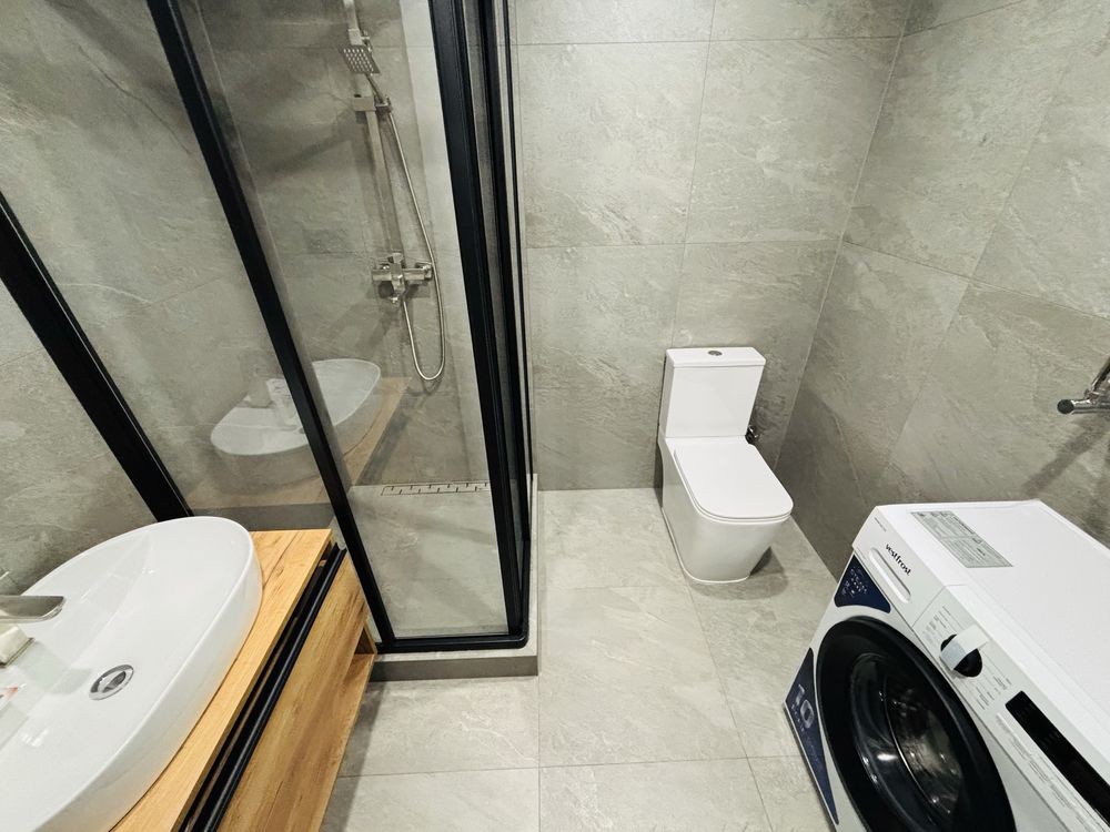 Ванна кімната виконана в сучасних сірих тонах, встановлена душова кабіна та вся сантехніка фірми “Ravak”.