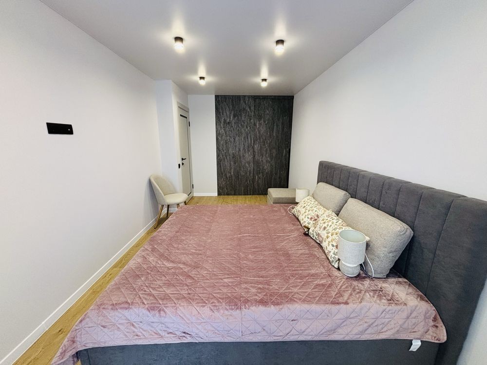 Спальна кімната облаштована великим ліжком із ортопедичним матрацом, а велика вбудована гардеробна шафа дає можливість розмістити всі речі майбутніх власників.