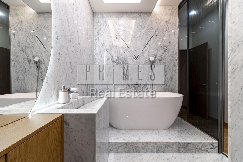 Простора квартира площею 179м2 з продуманим плануванням включає три спальні, одна з яких майстер-спальня, окремий кабінет та велику кухню-вітальню. Передбачено три санвузли.