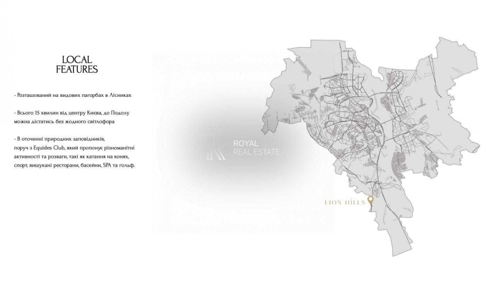 Комплекс "LION HILLS" це сучасний унікальний проект на мальовничій територіі в 16 гектарів в 15 хвилинах від центру Києва.