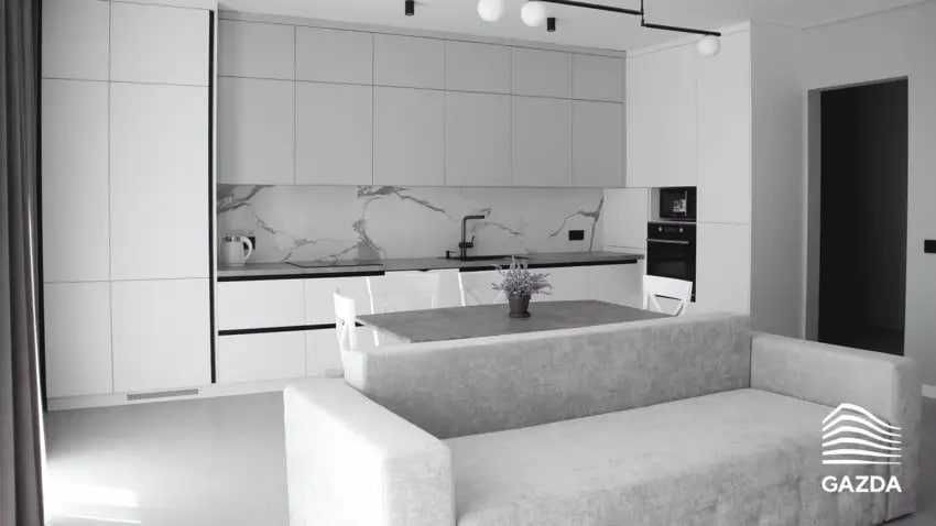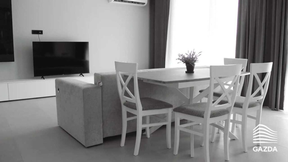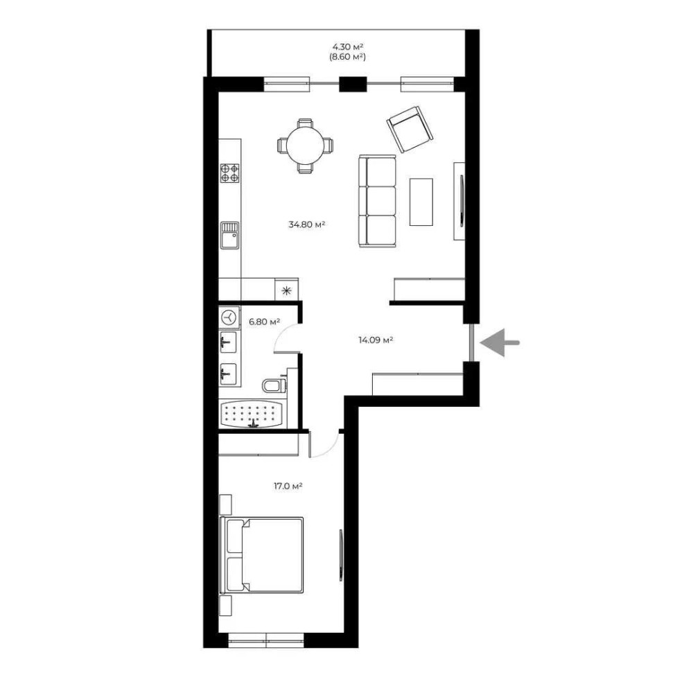 Складається з великої кухні-вітальні з виходом на балкон, окремої спальні та суміжного санвузла.