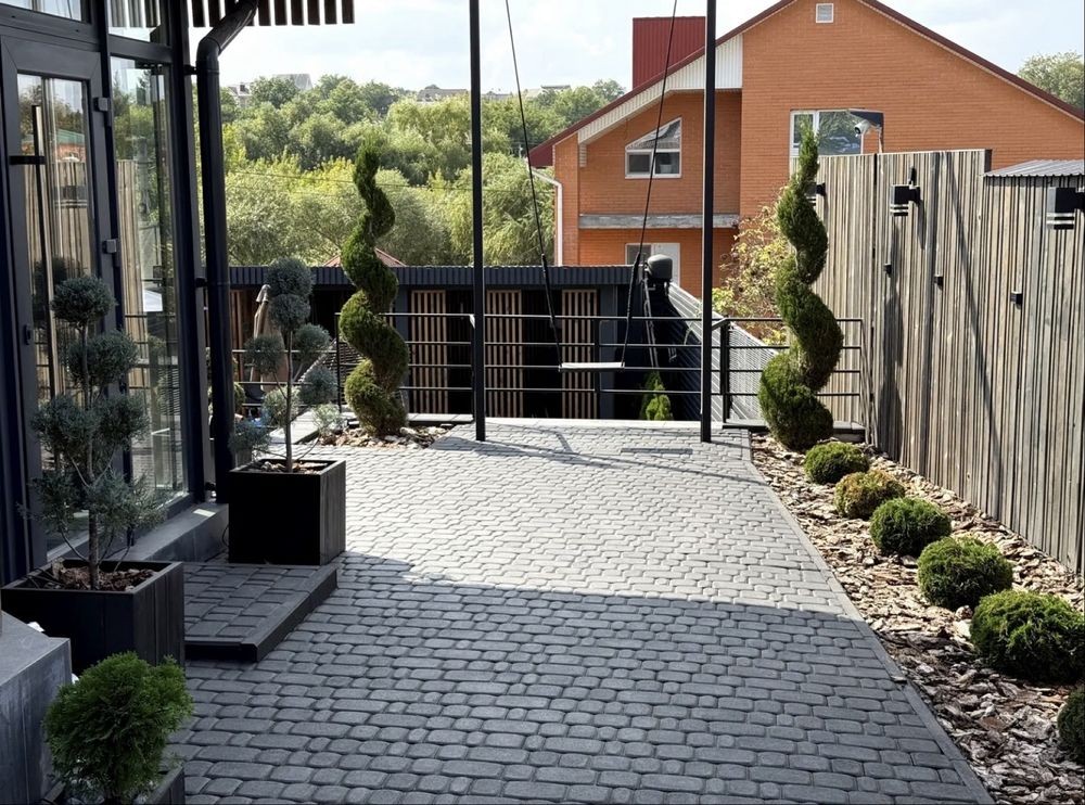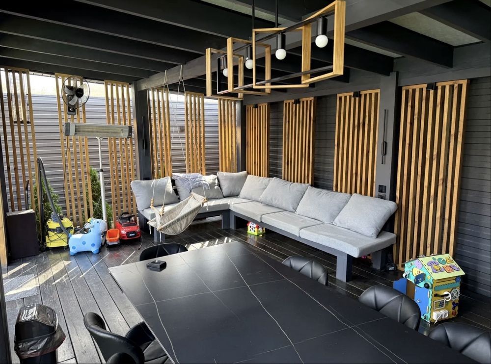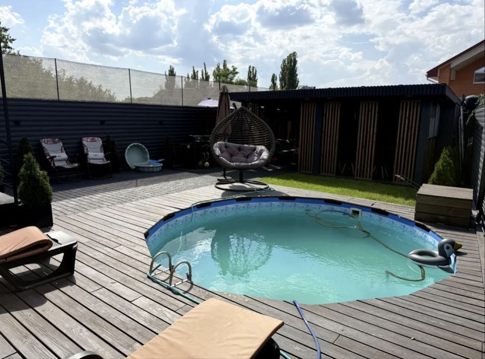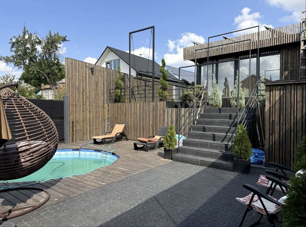 Двір з ландшафтним дизайном, альтанкою, басейном та мангальною зоною.