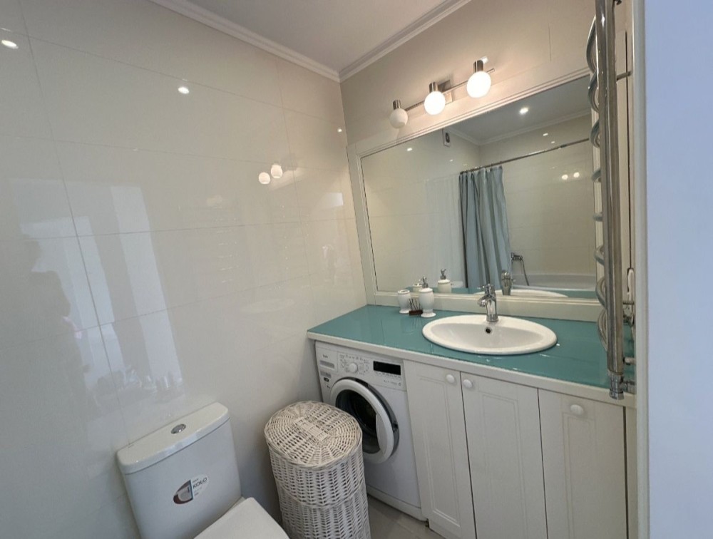 Сучасний санвузол з ванною, великим дзеркалом, зонованим світлом та усіма зручностями