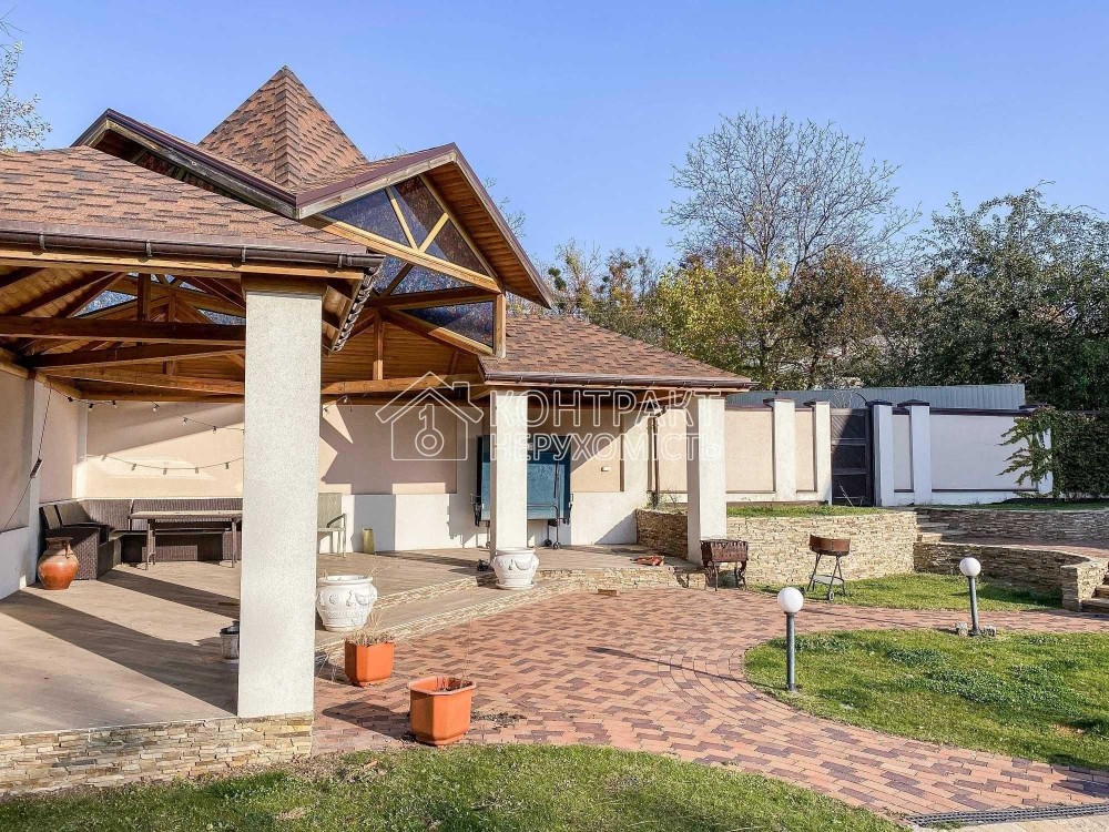 Доглянута територія: велика альтанка з мангалом, тераса для відпочинку, два паркувальні майданчики (до 4 авто), автонавіси, автоматичні ворота, окремий будинок для охорони,підсобні приміщення.