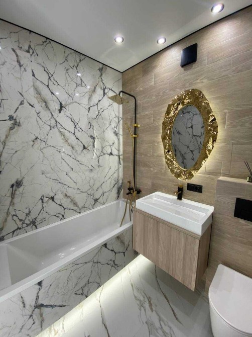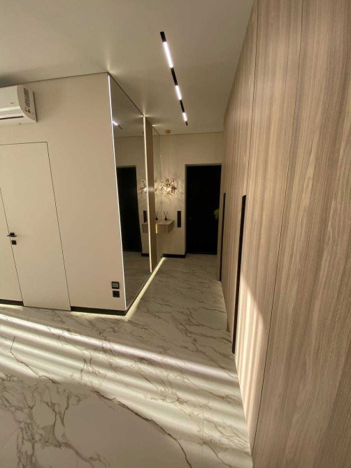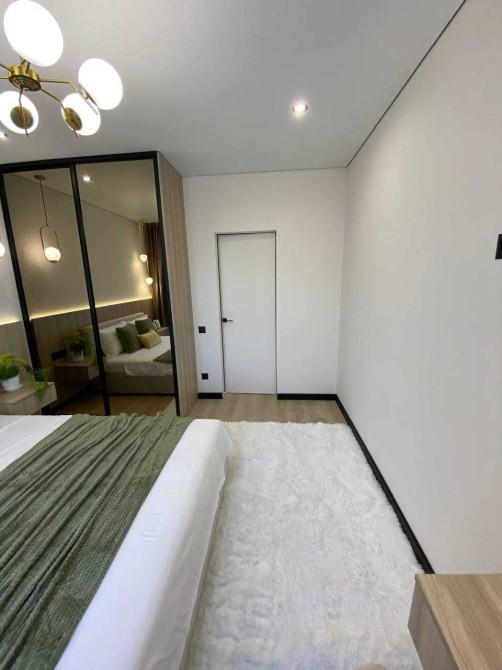 - спальня з великим ліжком, шафою з підсвіткою і стильною бьюті зоною.