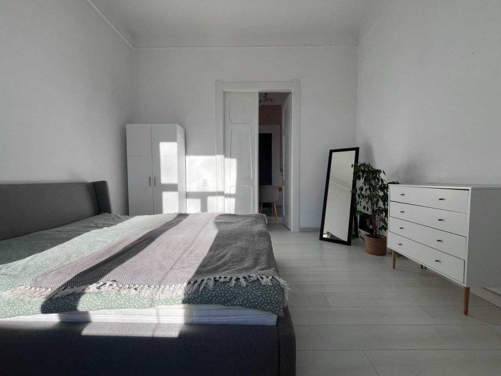У квартири дуже гарне та цікаве планування: 2 ізольовані спальні, вітальня, кухня, кладова з антресоллю, санвузол який має вихід в спальню та в кухню і прихожа.