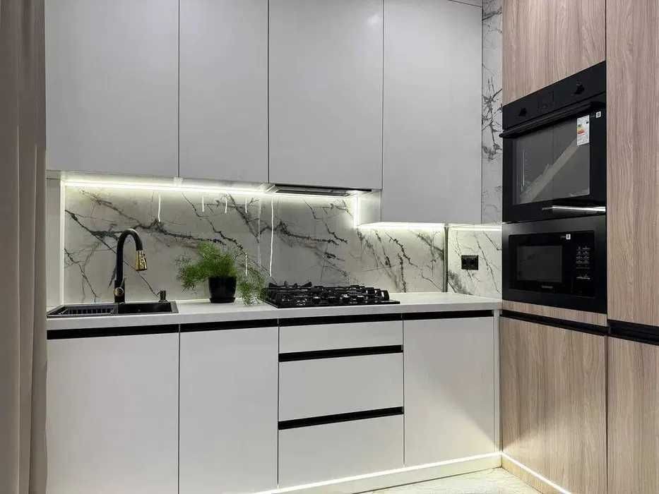 світла кухня-вітальня з повним оснащенням меблями та технікою