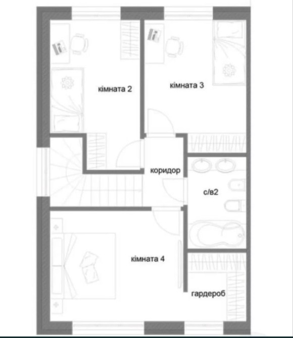Другий поверх — три окремі кімнати, зокрема дві дитячі, загальний санвузол і майстер-спальня з власним гардеробом.
