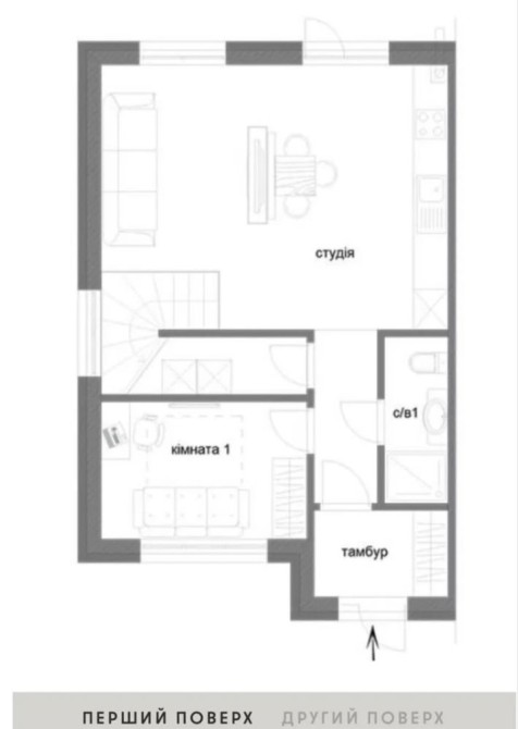 Перший поверх — простора кухня-вітальня, передпокій, гардероб, комора, кабінет або гостьова кімната.