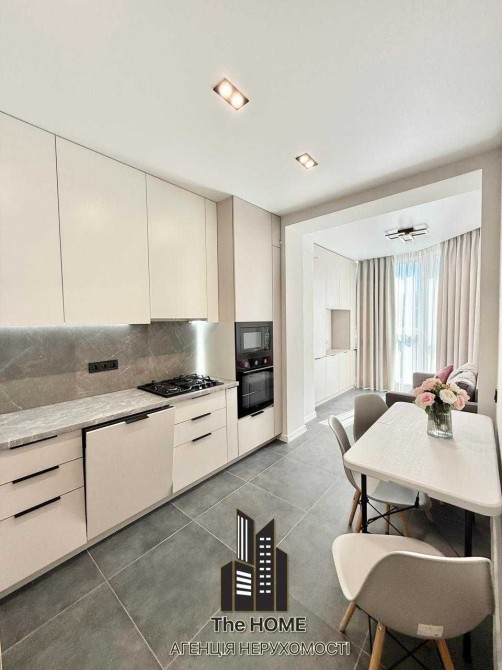Кухня наповнена всією необхідною технікою відомих виробників, є обідня зона та простора лоджія з панорамними вікнами.