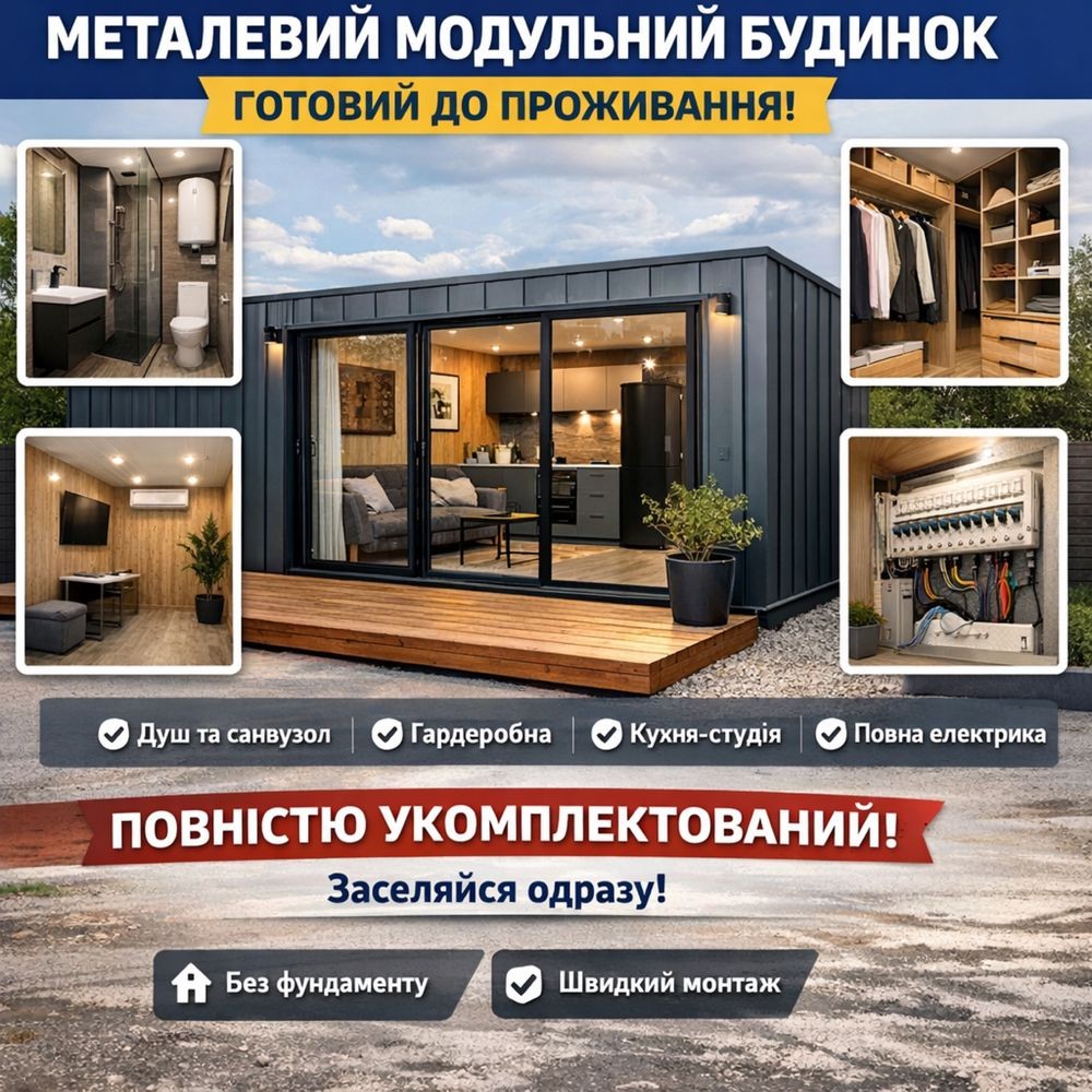 Пропонуємо сучасний металевий модульний будинок, повністю укомплектований та готовий до заселення без додаткових витрат.