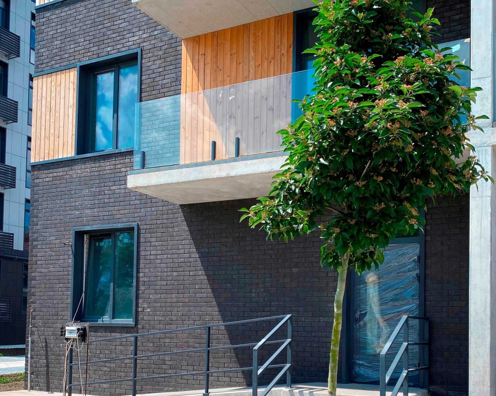 - Декоративна обробка фасаду виконана з керамограніту марки TUBADZIN.