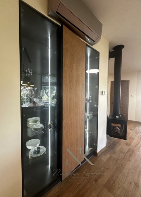 1 поверх: вхід в будинок, велика кухня-студія з дров’яним каміном та обідньо-столова зона з виходом на терасу; санвузол; гардеробна кімната.