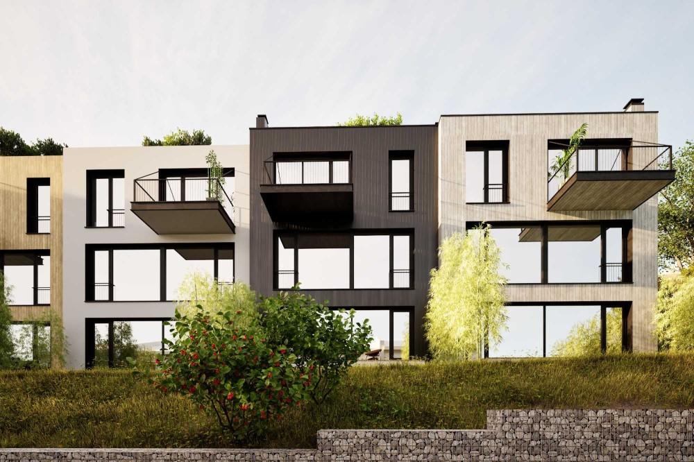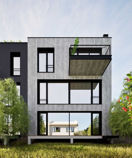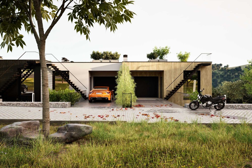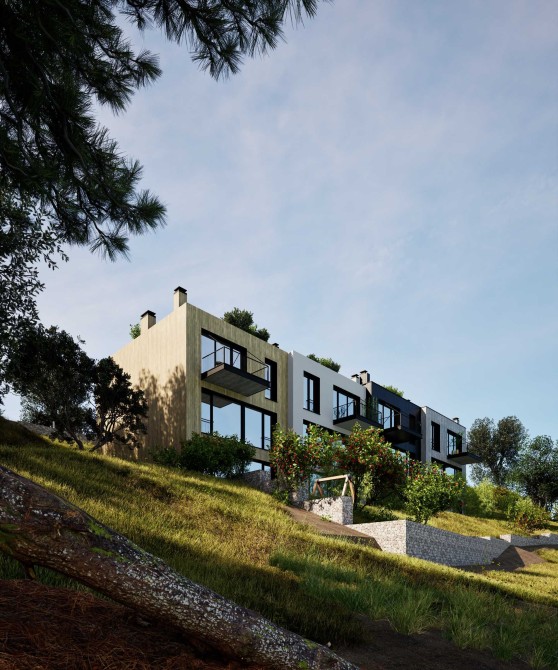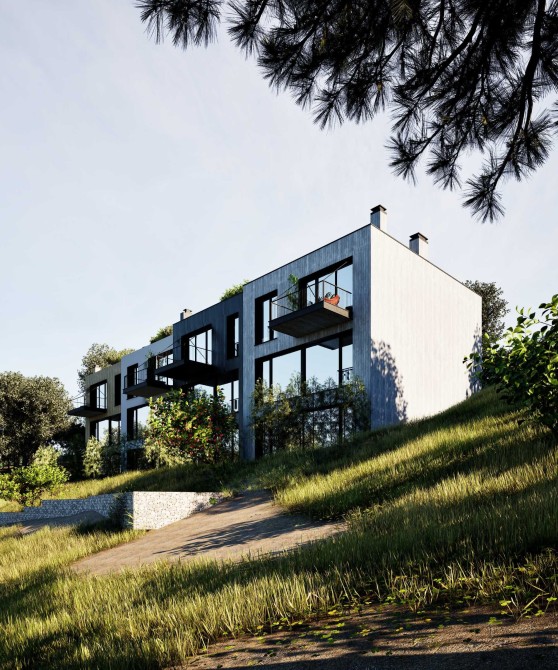 Котеджі знаходяться на похилій ділянці , через це заїзд відбувається на 3 поверх, і потім вже йдуть два поверхи вних + вихід на дах