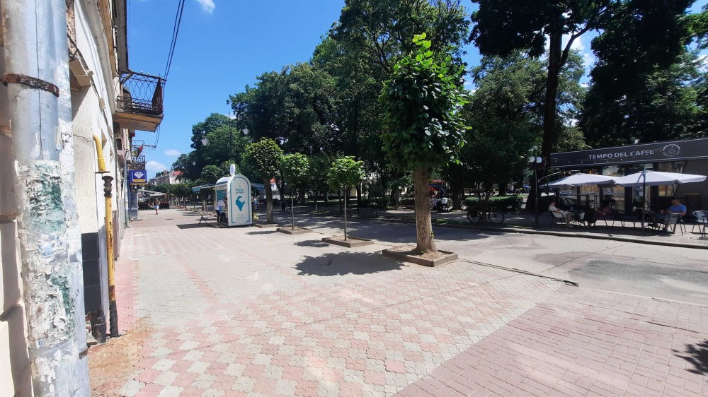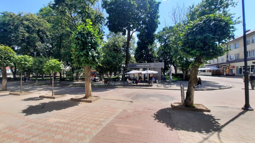 вихід з підїзда в центр міста навпроти TEMPO DEL CAFFE та міського фонтана