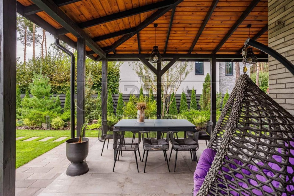 На території є відкрита тераса з мангалом та літньою кухнею. У теплу пору року готувати та влаштовувати зустрічі з друзями, милуючись садом і басейном, — одне задоволення! Після вечері на терасі можна легко переміститися до зони відпочинку з вогнищем, де приємно провести кінець вечора під потріскування полум’я, загорнувшись у пледи.