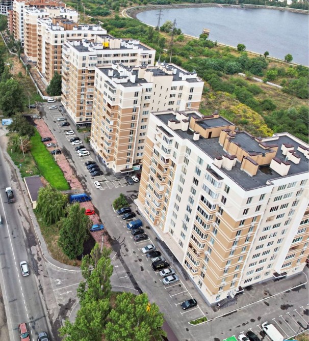 Велика парковка, дитячі майданчики, поряд водосховище.