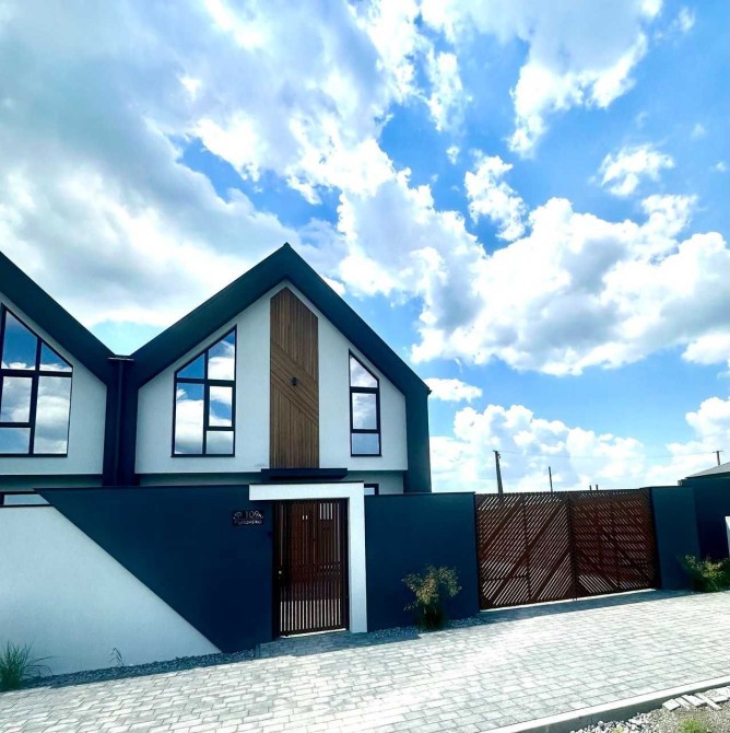 Будинок розташований на ділянці S = 3 сотки з тротуарною плиткою, сучасною огорожею в стилі будинку по периметру ділянки та воротами.