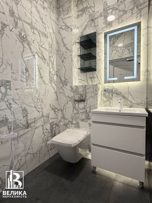 Санвузол з душовою кабіною та скляною перегородкою, інсталяція підвісного унітазу Grohe, гігієнічний душ, підігрів підлоги, рушникосушарка в плитці, вентилятор із затримкою вимкнення.