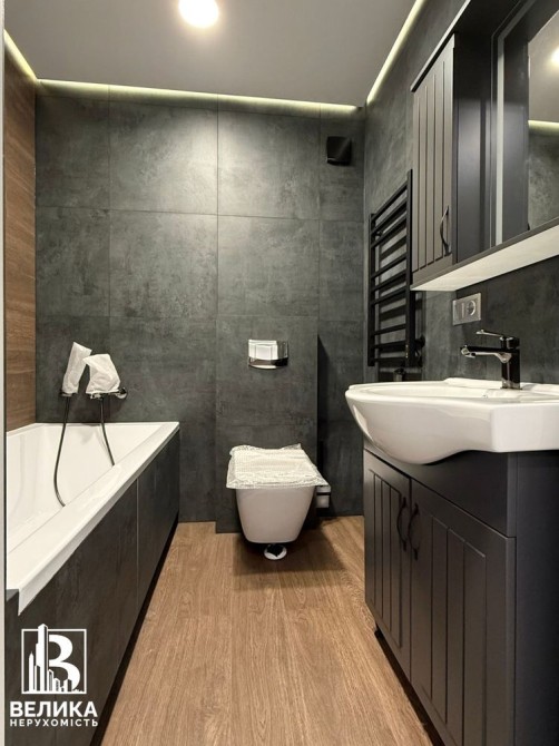Санвузол з великою ванною 175*80, інсталяція підвісного унітазу Grohe, умивальник з тумбою, дзеркало, електричний підігрів підлоги.