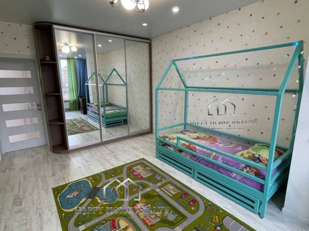 Функціональне планування: кухня-студія, затишна спальня та світла велика дитяча кімната з фізкультурою стінкою.