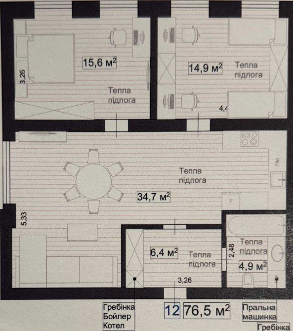 • Водяний підігрів підлоги (утеплювач 5 см + звукоізоляція)