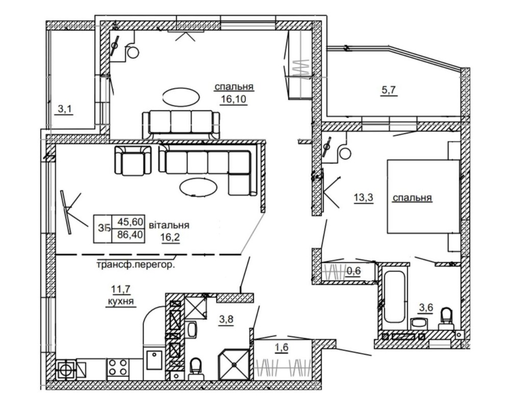 • Трехкомнатная