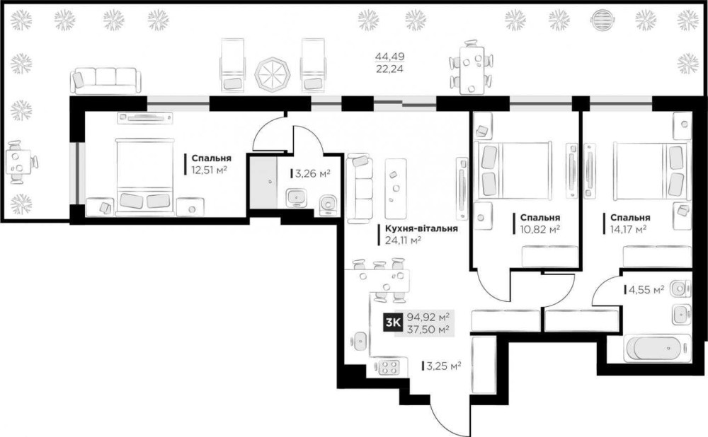Загальна площа — 94.92 м², житлова — 37.50 м², кухня — 24.11 м².