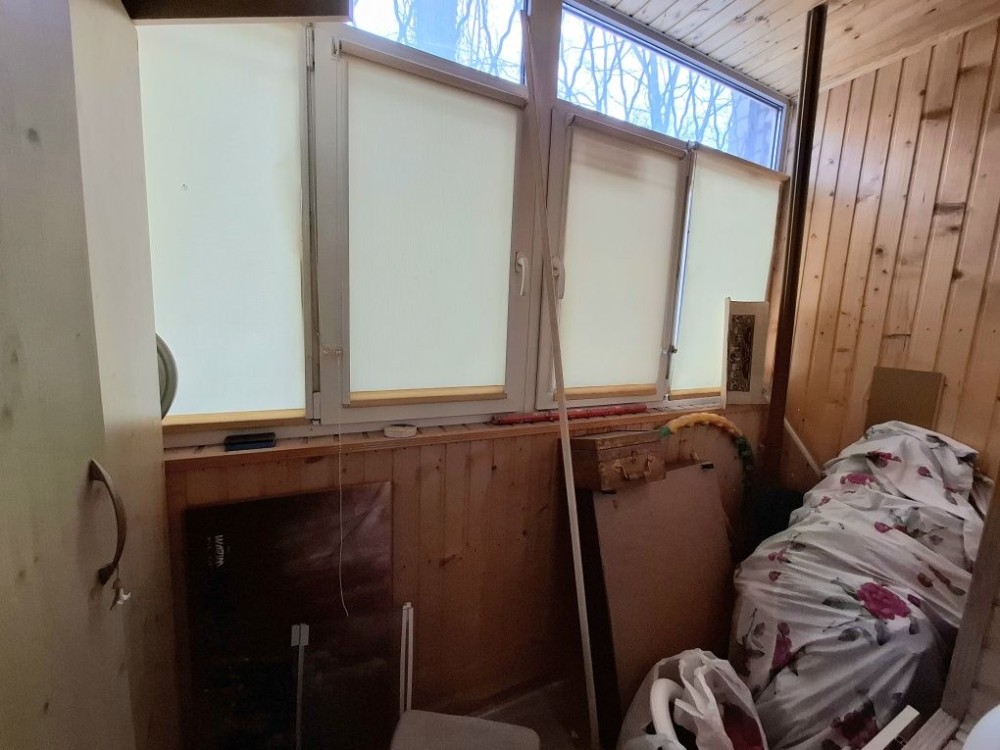 - лоджия из спальни застеклена металлопластом, утеплена и обшита под дерево