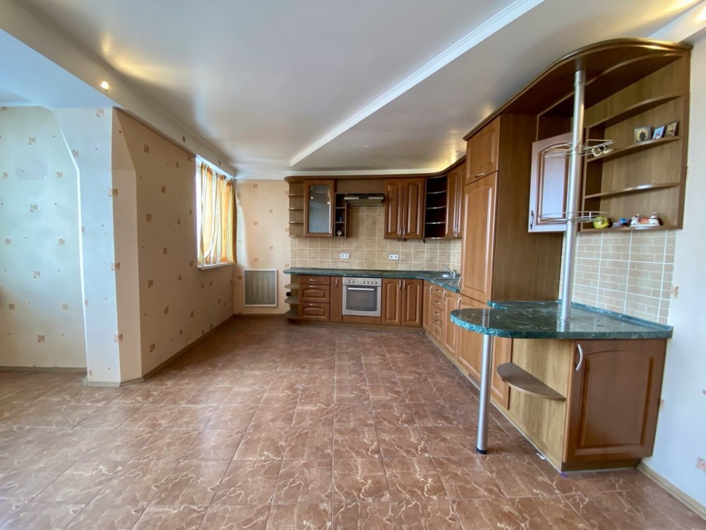 Товщина стін - 70 см, висота стелі - 3м, загальна площа - 122м2, житлова - 55м2, кухня - 23м2.