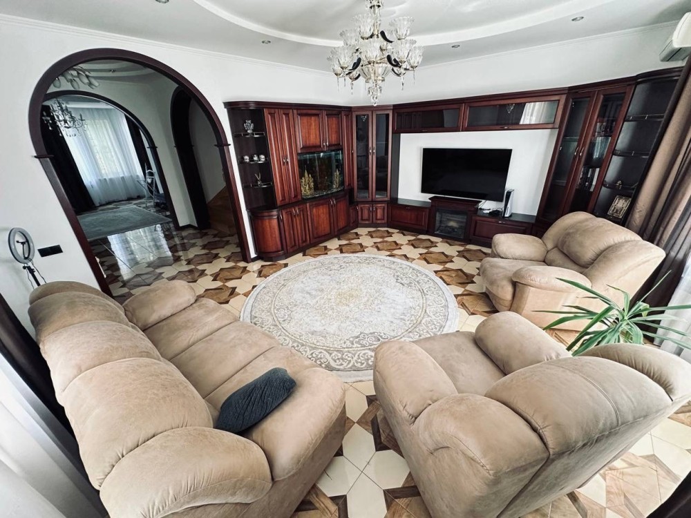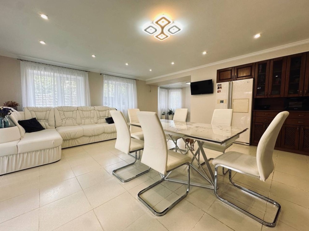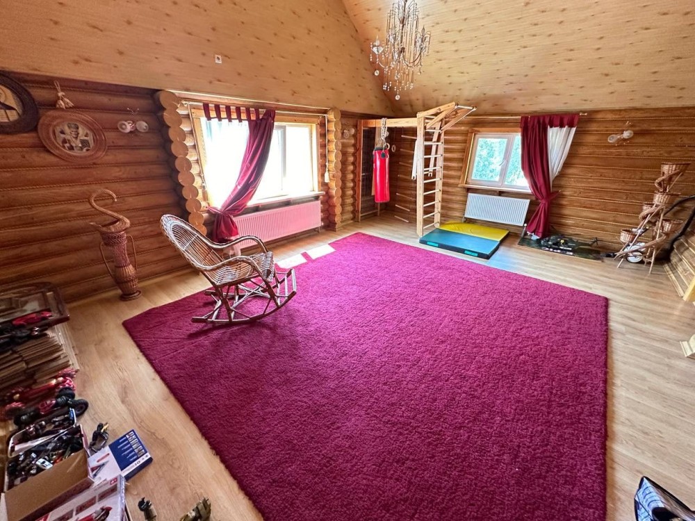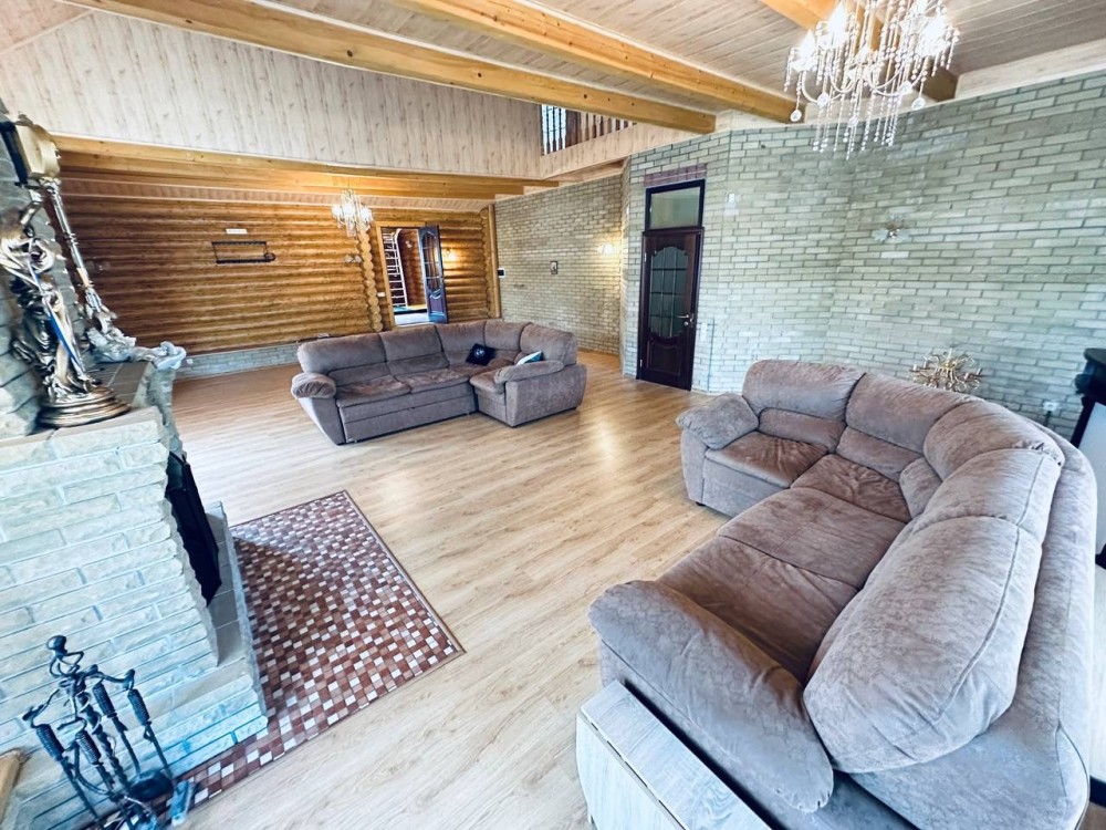 Просторная кухня , гостинная , каминный зал, 5 спален ( 2 из них без ремонта ), 3 сан узла , сауна,гараж.
