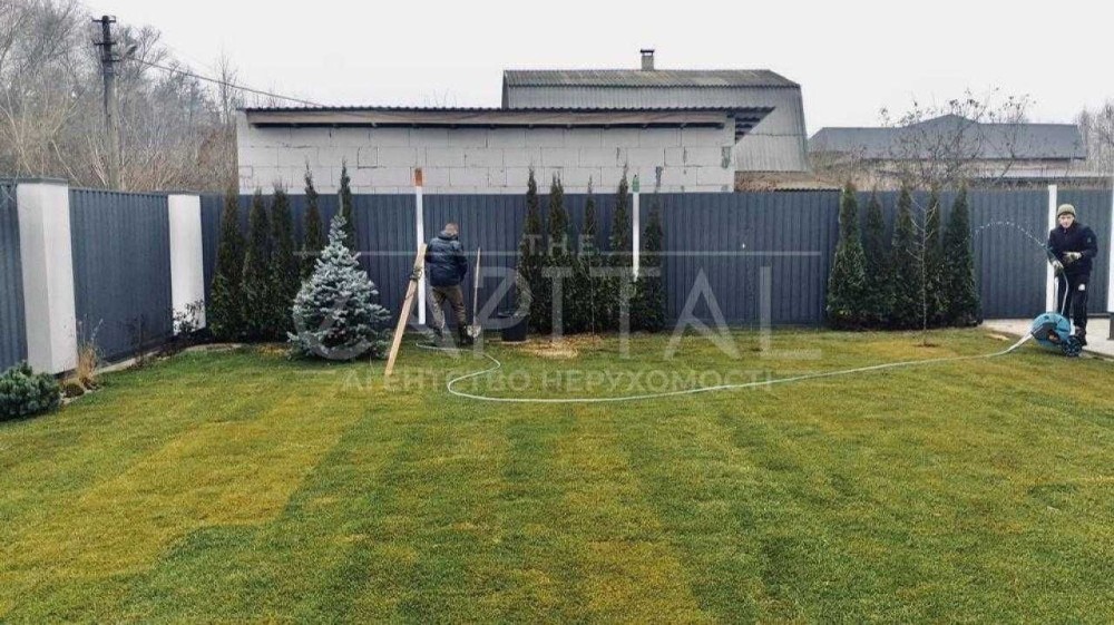 Будинок розташований на доглянутій ділянці площею 6 соток: висаджені туї створюють атмосферу приватності, а акуратний зелений газон додає простору охайного вигляду.