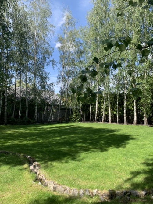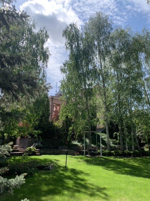 Дом утопает в зелени. Берёзы, туи, голубые ели, насаждения, цветы, ручеёк , белки создают атмосферу пребывания в заповеднике .