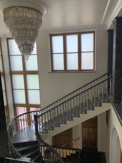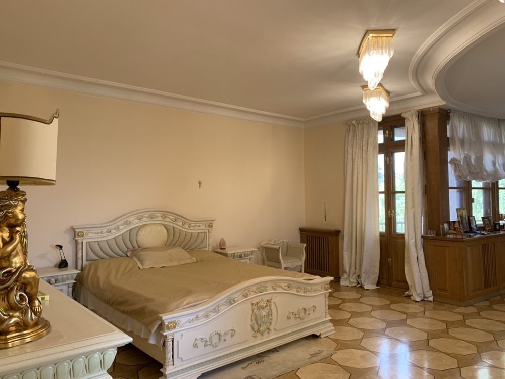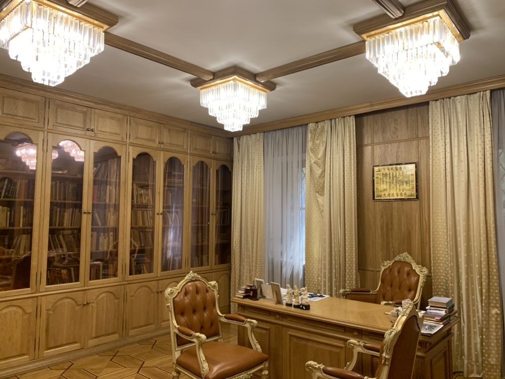 Дом построен из кирпича, евроремонт, 4этажа, большие залы, просторные комнаты, гостиная, кухня, столовая, гардеробные, террасы с потрясающим видом. Хрустальные люстры, гранитные лестницы и хол с огромной люстрой из итальянского хрусталя с позолотой 22 карата. Также есть зона отдыха, библиотека, кабинет.