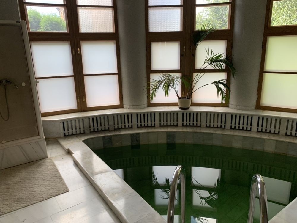 Есть два камина, бассейн, спортзал, баня, мраморная ванная комната, гараж на две машины (+парковочные места на улице) видеонаблюдение, сигнализация. На территории шикарный газон, домик для охраны. Бронированные двери и ворота.
