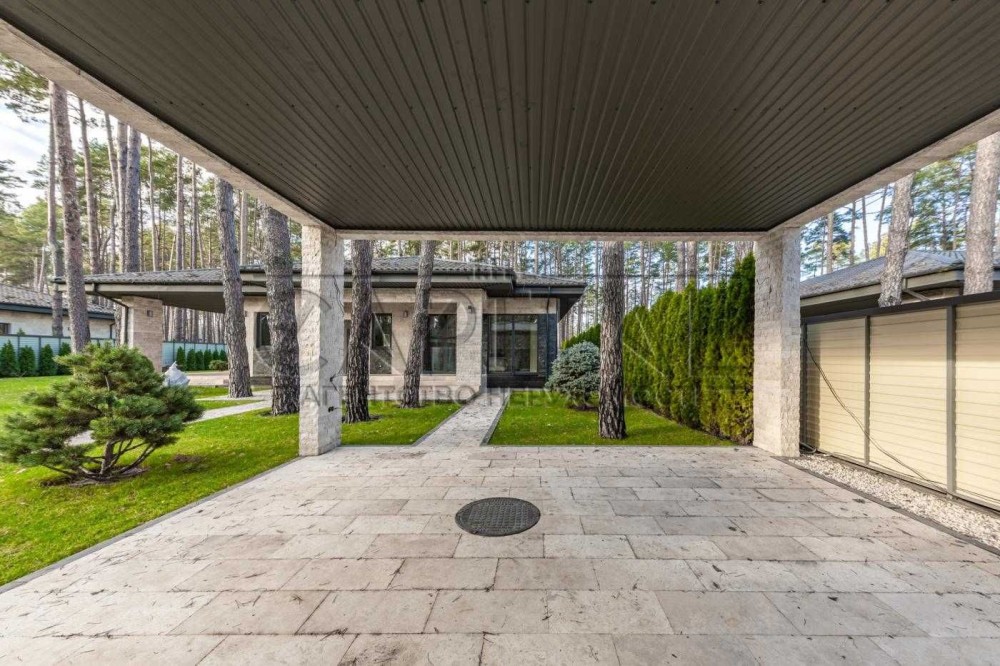 На території домоволодіння: будинок, навіс на два авто, окремо облаштована зона барбекю – все в одному стилі, оздоблення фасаду натуральний травертин.