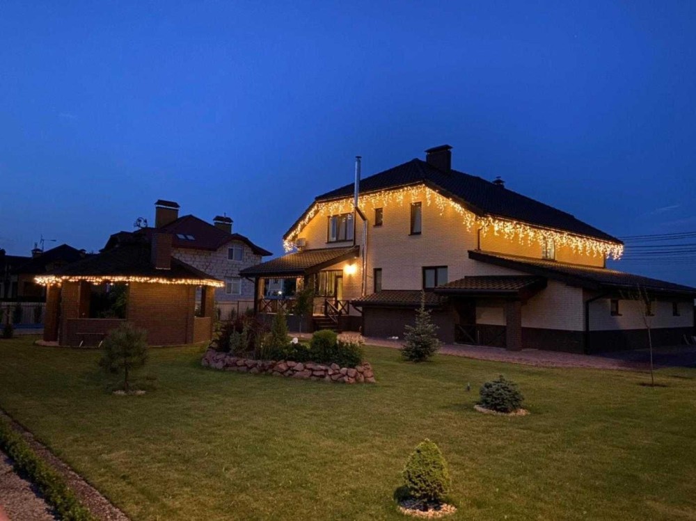 Заведена електрика 20 кВт, інтернет, є відео спостереження по всіх ділянках та периметру , також підведений газ на ділянку (але не заведений в будинок), опалення електро котел 18 кВт (HI- term) та твердопаливний котел «Зубр» 30кВт, буферна ємність на 500 літрів , бойлер на 300 літрів, акумулятор та система безперебійного живлення для котла і насосів на випадок відсутності світла для зручності все це встановлено в окремій кімнаті в підвальному приміщенні з окремим входом з вулиці або входом з будинку.