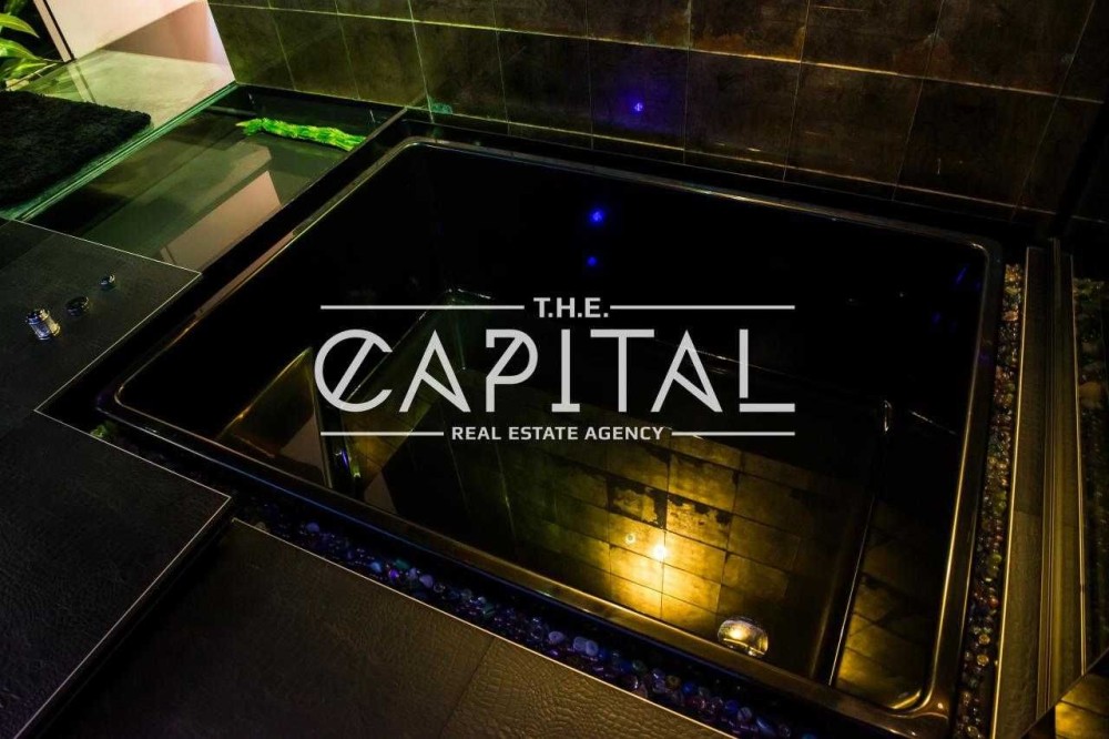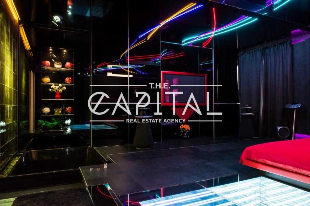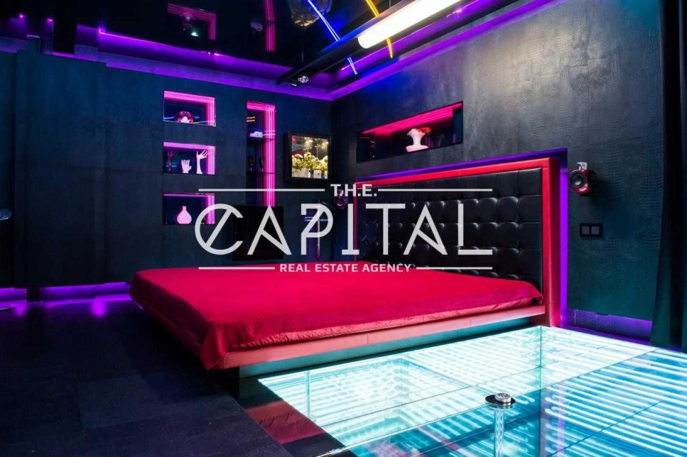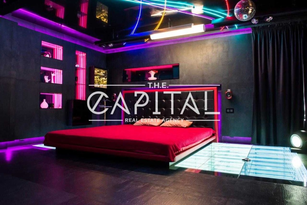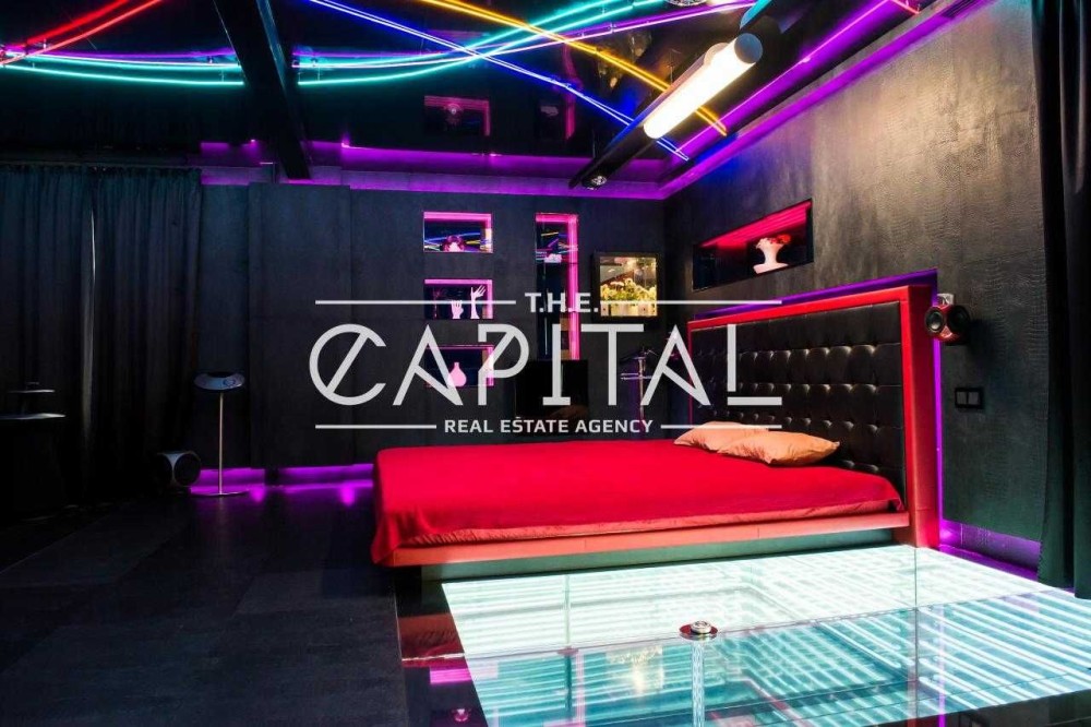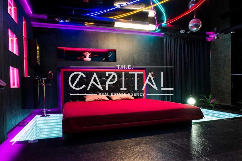 - велика футуристична спальня з двоспальним ліжком, домашнім кінотеатром, джакузі та акваріумом