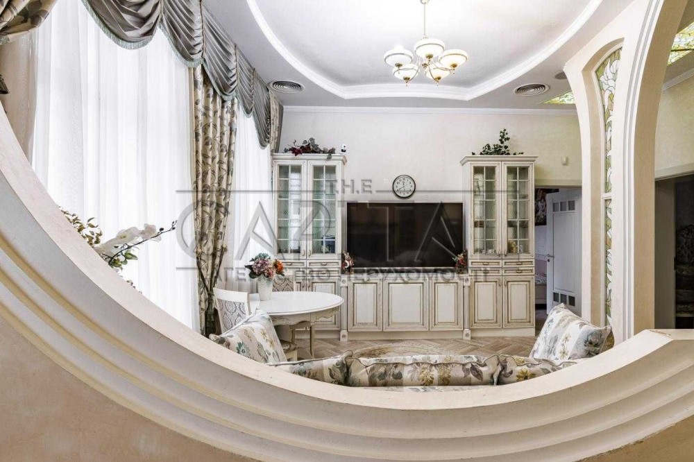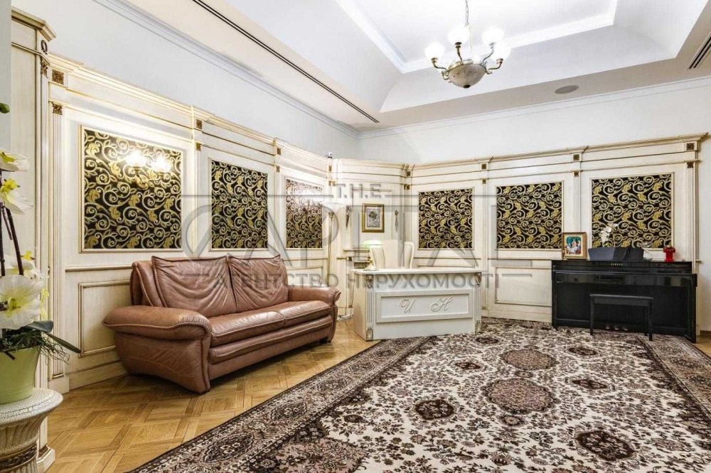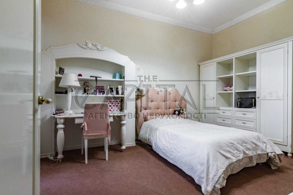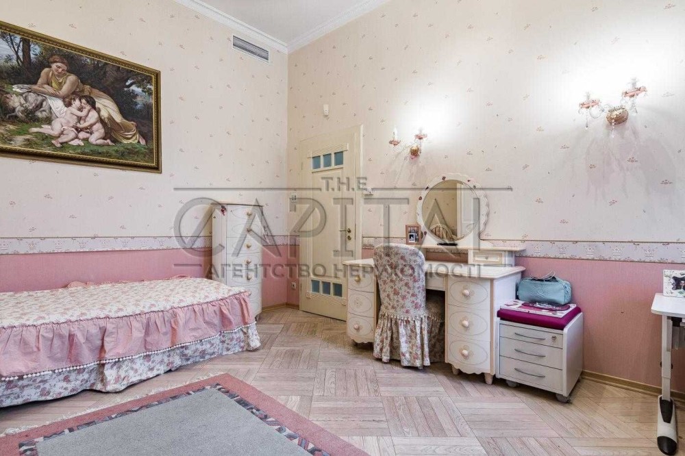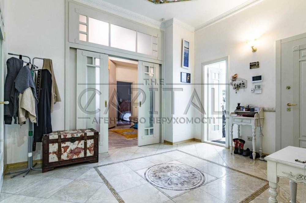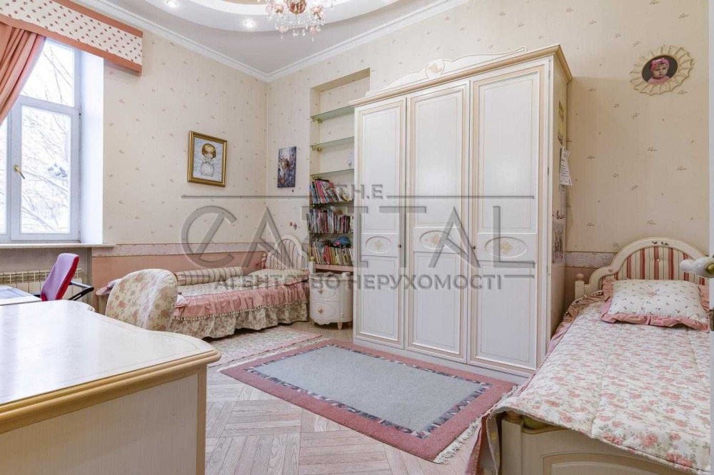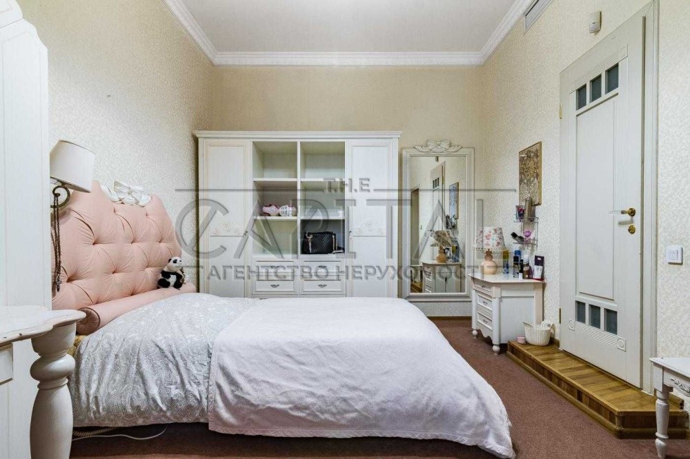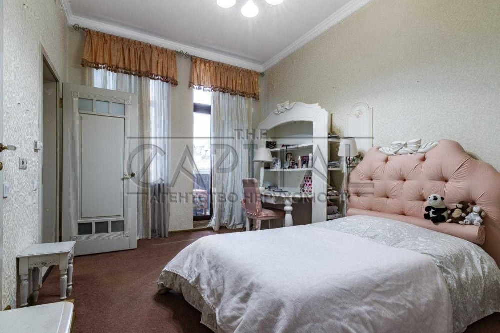 Три спальні, кабінет, кухня-вітальня, дві гардеробної, два санвузли, два балкони, технічна кімната. ВІкна виходять у два закритих дворики між будинками.