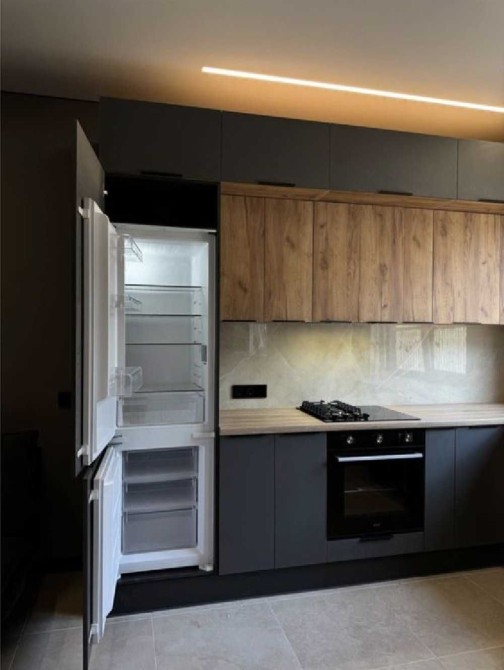 Кухня оборудована встроенной мебелью и бытовой техникой.