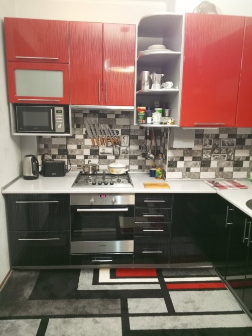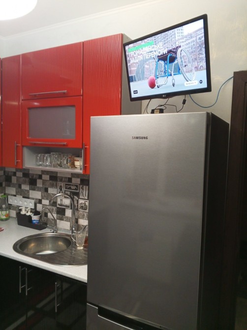 На кухне красивая дорогая стенка из МДФ. Дорогая техника , холодильник Самсунг , плита и духовой шкаф Бош, микроволновка Горение, телевизор Самсунг.