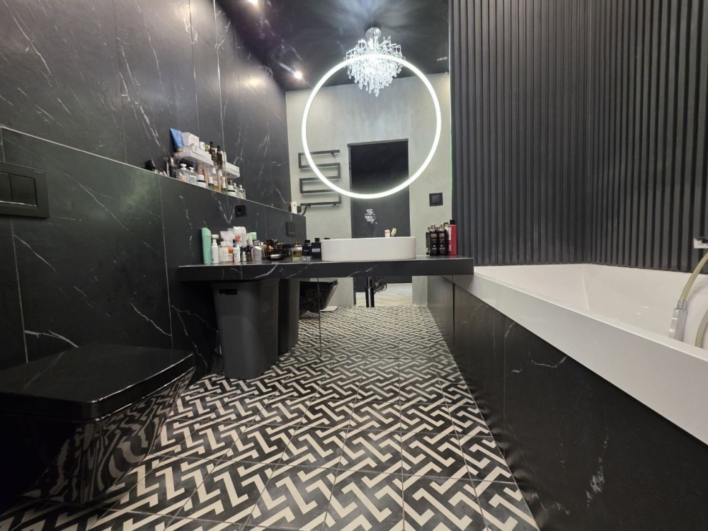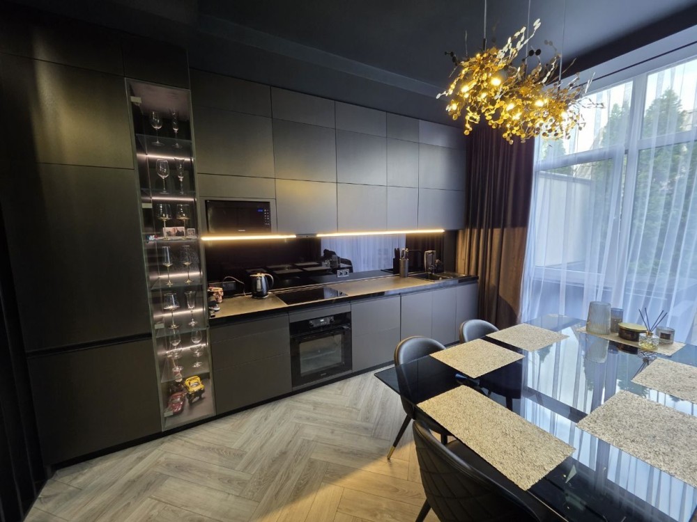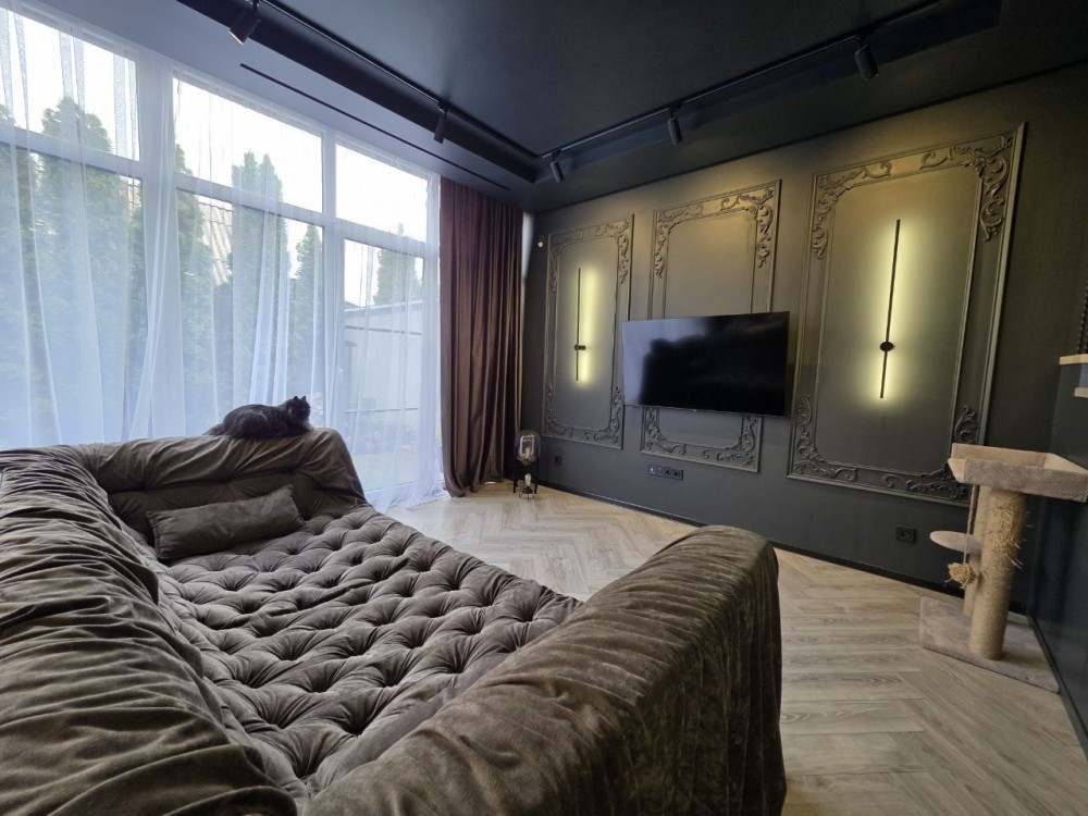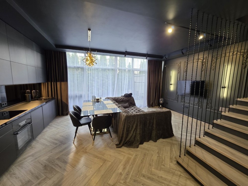 Квартира з якісним дизайнерським ремонтом площею 73,3м2 + гараж 26м2 та двір у 30м2. Стелі заввишки 3м. У гаражі місце на 2 машини.
